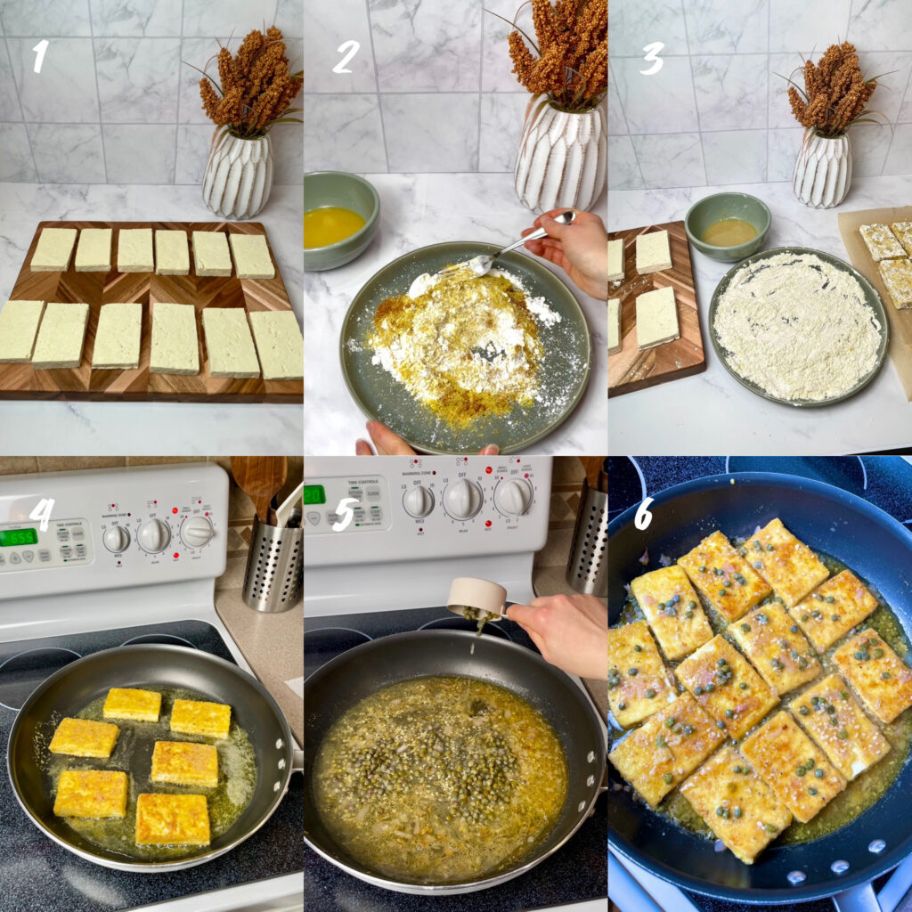 - Press tofu for 30 minutes and pat dry. Cut each tofu block in half horizontally, then cut each half into thirds vertically to create tofu slabs. (6 total slabs per block of tofu)
