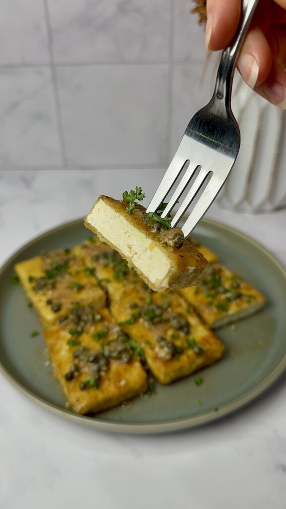 - Add tofu to the pan and simmer for 1-2 minutes coating tofu in sauce. Remove tofu from pan, then add in 1 additional tbsp of butter and whisk into capers and sauce. Pour sauce over tofu and garnish with parsley.